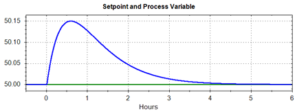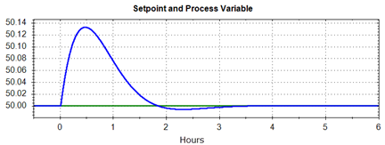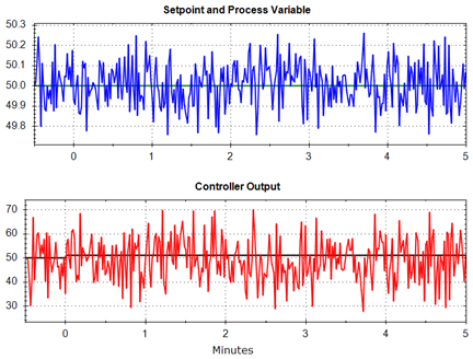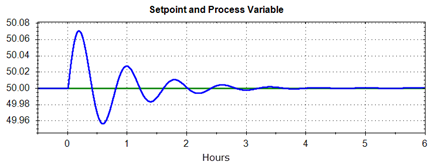 An experienced control engineer would recognize that a controller gain of 82 (from the previous example) is impractical and may reduce it to a more reasonable value, such as 5. However, changing only KC introduces a new problem: the control loop may exhibit slow, sustained oscillations following a disturbance.